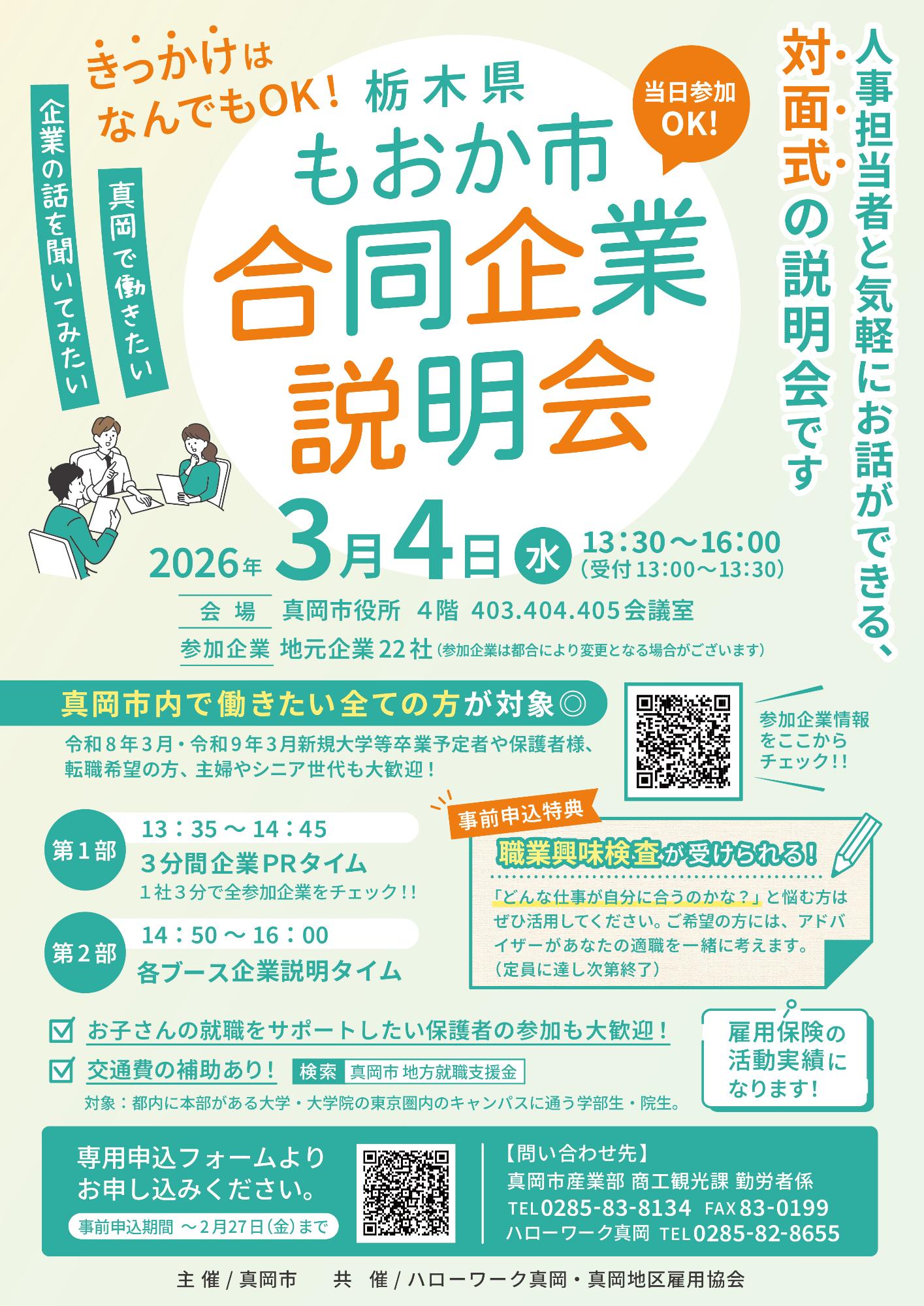対象が、真岡市内で働きたい全ての方、2026年3月・2027年3月新規大学等卒業予定者、保護者様、転職希望の方、主婦やシニア世代・・・ととても幅広い層になっています。弊社も保護者様と一緒のご参加大歓迎です!